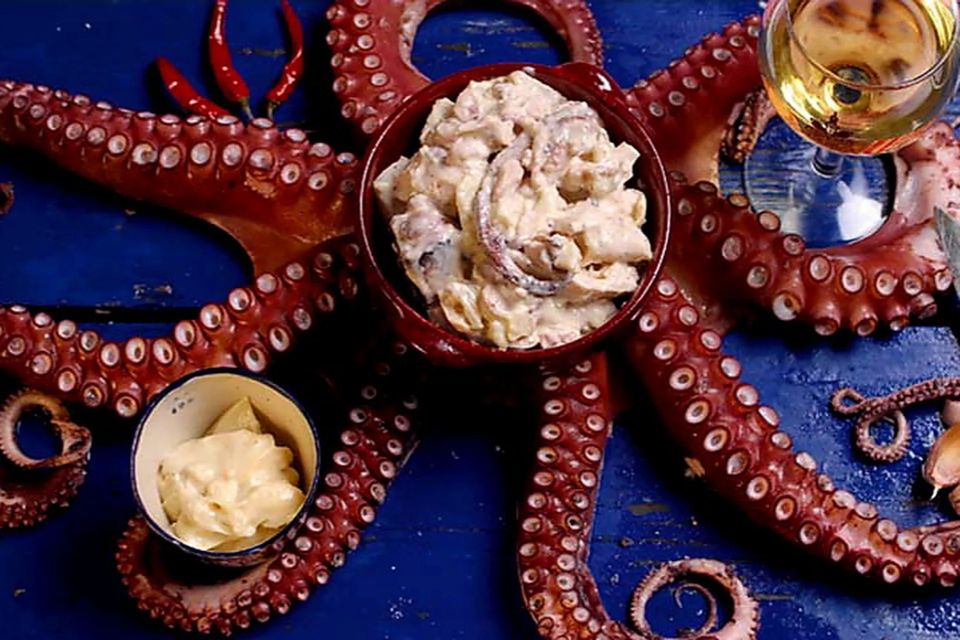 Une fois la cuisson terminée, le poulpe et les pommes de terre sont soigneusement découpés, puis dressés simplement, dans l’esprit des recettes traditionnelles du littoral. Le tout est ensuite généreusement accompagné d’un aïoli maison, préparé dans la pure tradition, avec de l’ail, de l’huile d’olive et tout le savoir-faire du Sud.